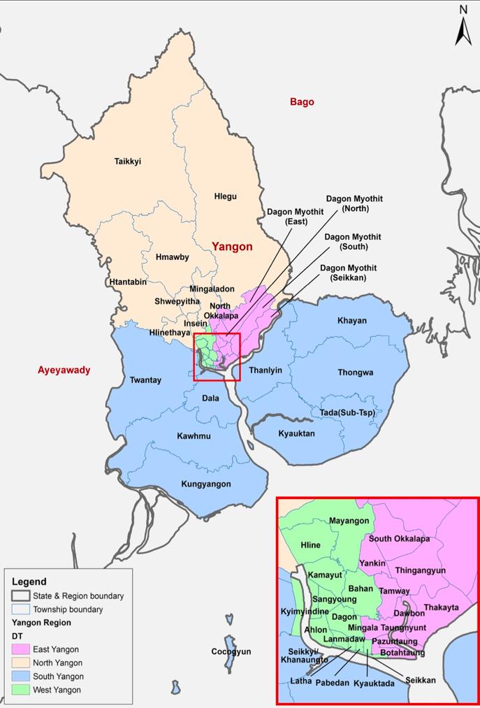 仰光及附近地图,红框右边Thanlyin为沙廉